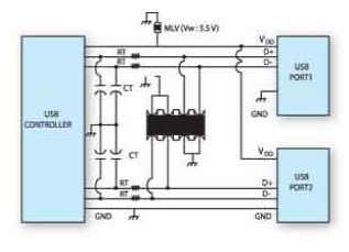 許多高速數(shù)據應用和終端產品采用混合式保護方式,在數(shù)據和時鐘線上采用基于間隙的器件,在電源連接部分采用多層壓敏電阻或基于硅的瞬態(tài)電壓抑制二極管。例如,USB接口的D+和D–線要求高速保護,這可以采用分立的芯片利用附加的多層壓敏電阻或瞬態(tài)電壓抑制器件用于VDD電源保護。PC、筆記本電腦、上網本等產品中常常需要多個USB接口連接。