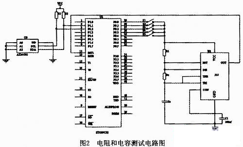 單片機(jī)測得振蕩輸出的頻率,計算后即可得到電阻和電容的值。不同量程對應(yīng)不同的電路參數(shù),利用開關(guān)可方便地選擇對應(yīng)不同量程的對應(yīng)電路。