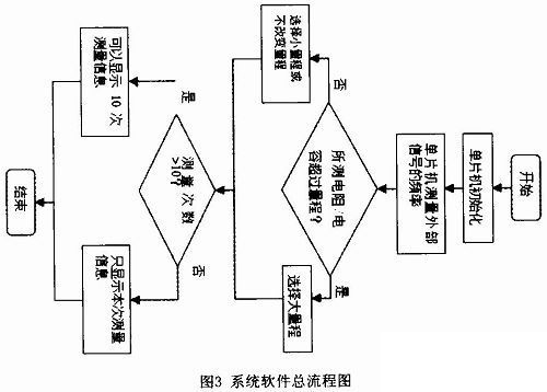 主要的子程序包括頻率測量子程序、鍵盤掃描子程序和數(shù)據(jù)存取子程序。頻率測量程序是系統(tǒng)軟件的核心,原理是用一個標(biāo)準(zhǔn)的頻率時鐘去計算被測的頻率,頻率測量程序流程圖如圖4所示。