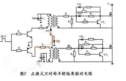 文獻提出一種正激式不對稱半橋隔離驅(qū)動電路,如圖2所示。
