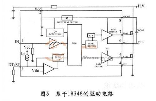 ST公司的L6384是專門的不對稱半橋驅(qū)動芯片,其原理圖及外圍電路如圖3所示。單脈沖從1腳(IN)輸入,5腳(HVG)和7腳(LVG)輸出互補的脈沖。3腳(DT/ST)外接電阻和電容來控制兩路輸出的死區(qū)時間。當3腳的電平低于0.5V的時候,芯片停止工作。專用芯片具有外圍電路簡單、占用空間小的特點,但由于其成本較高,不適用于低成本設(shè)計的產(chǎn)品