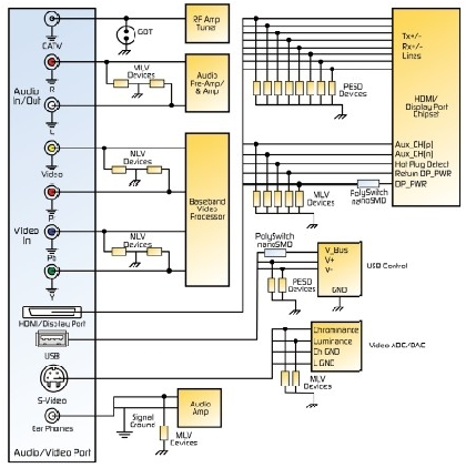 圖4. 典型的運(yùn)用MLV元件, PESD抑制元件以及PolySwitch過電流保護(hù)元件的顯示端口電路保護(hù)設(shè)計(jì)
