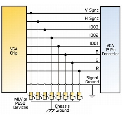 LCD電視上的VGA端口起到從一個(gè)計(jì)算機(jī)視頻卡有效連接的作用。ESD或者電纜脫落情況可以引起VGA端點(diǎn)的故障。IEC 61000-4-2要求在這里是可行的,并且諸如PESD 和3pF MLV