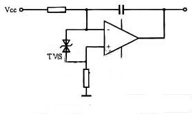 集成運放對外界電應力非常敏感。因此,在使用運放的過程中,如果因操作失誤或采取了不正常的工作條件,往往會出現過大的電壓或電流,特別是浪涌和靜電脈沖,從而很容易使運放受損或失效。圖5所示是用TVS在運放差模輸入端防止過壓損傷的保護電路。