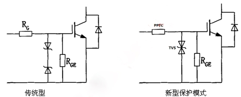 傳統保護模式:防護方案防止柵極電荷積累及柵源電壓出現尖峰損壞IGBT——可在G極和E極之間設置一些保護元件,如下圖的電阻RGE的作用,是使柵極積累電荷泄放(其阻值可取5kΩ);兩個反向串聯的穩壓二極管V1和V2,是為了防止柵源電壓尖峰損壞IGBT。另外,還有實現控制電路部分與被驅動的IGBT之間的隔離設計,以及設計適合柵極的驅動脈沖電路等。然而即使這樣,在實際使用的工業環境中,以上方案仍然具有比較高的產品失效率——有時甚至會超出5%。相關的實驗數據和研究表明:這和瞬態浪涌、靜電及高頻電子干擾有著緊密的關系,而穩壓管在此的響應時間和耐電流能力遠遠不足,從而導致IGBT過熱而損壞。