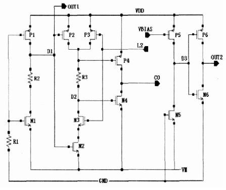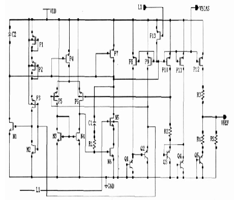 圖1中N1,N2, P1, P2, P3, C1作為啟動電路,有源電阻P1, P2 起限流作用。N5, P13 為開關管,當保護電路處于休眠狀態時,電路必須停止工作,使功耗降為最低,此時通過內部控制電路使L1 為低電位, P13 管打開,使偏置點VB IAS上升為高電位,P4, P7, P8, P9 , P10, P11, P12管截止,N5管關閉,切斷由P13,N6形成的支路,該電路停止工作,電流幾乎為零。經仿真,該基準電路在2. 2V電壓下可正常工作。