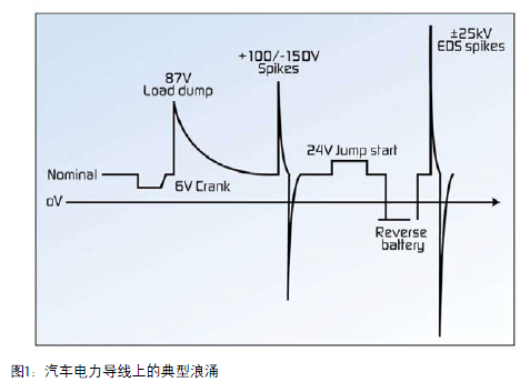 圖1中顯示了最常見(jiàn)的電源軌瞬態(tài)。從嚴(yán)重的低電平-高能量到高電平-低能量的瞬態(tài)變化。特別關(guān)注的是,這些電源系統(tǒng)上得瞬態(tài)變化應(yīng)滿足ISO7637-2和ISO10605標(biāo)準(zhǔn)。