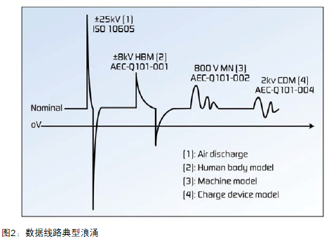 圖2顯示數(shù)據(jù)線路上產(chǎn)生的瞬態(tài)主要是ESD浪涌。盡管此類(lèi)浪涌為低能量,但是會(huì)產(chǎn)生強(qiáng)大的電磁場(chǎng)。