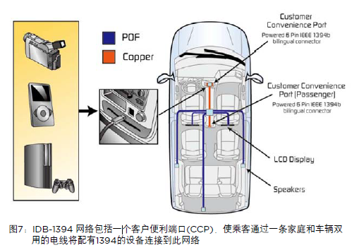 IDB-1394車(chē)載結(jié)構(gòu)可分為內(nèi)置網(wǎng)絡(luò)和客戶(hù)便利端口,簡(jiǎn)稱(chēng)CCP,如圖7所示。該標(biāo)準(zhǔn)顯示了一種類(lèi)似于現(xiàn)有MOST標(biāo)準(zhǔn)的一種內(nèi)置塑料光纖(POF)車(chē)載網(wǎng)絡(luò)。然后,該網(wǎng)絡(luò)更加穩(wěn)固且更易使用。多種電子元件可以連接到此網(wǎng)絡(luò),如DVD播放器、視屏顯示器、導(dǎo)航系統(tǒng)、無(wú)線電主機(jī)以及通訊設(shè)備。
