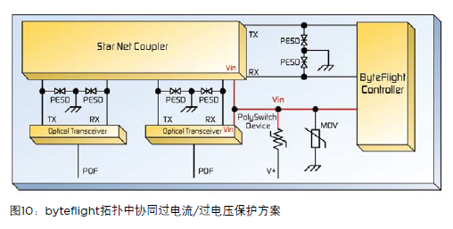 byteflight協(xié)議是一個(gè)車(chē)載數(shù)據(jù)總線,為提供車(chē)載元件之間進(jìn)行非常安全且容錯(cuò)的電子通訊手段而開(kāi)發(fā)。byteflight在總線、星形或集群配置中通過(guò)2線或3線塑料光纖(POF)達(dá)到10Mbps以上的速度。該系統(tǒng)結(jié)構(gòu)中使用POF使其功能能夠在數(shù)據(jù)方面達(dá)到電氣上的獨(dú)立。然而,節(jié)點(diǎn)仍然從車(chē)載供電總線處獲得電流,而且會(huì)受到電磁干擾的影響。構(gòu)成該網(wǎng)絡(luò)的元件,如微處理器、byteflight控制器和光收發(fā)器,容易因供電尖峰和反向電壓而受到損傷。集成電路(ICs)或許包括ESD保護(hù),但是通常限制在2kV以下。如圖10所示,PolySwitch設(shè)備和MLV可以保護(hù)這些模塊不受高能量過(guò)電壓和過(guò)電流瞬態(tài)的影響而產(chǎn)生損傷。