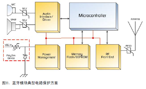 藍(lán)牙標(biāo)準(zhǔn)雖然最初并非為車(chē)載環(huán)境而設(shè)計(jì),但已經(jīng)為車(chē)輛和其系統(tǒng)之間進(jìn)行溝通的移動(dòng)電子設(shè)備創(chuàng)造了新的市場(chǎng)前景,如手機(jī)、MP3播放器和導(dǎo)航設(shè)備。保護(hù)暴露在外的通訊界面不受因天線和儀器無(wú)線(RF)界面所產(chǎn)生的ESD和其他電壓浪涌的影響是一個(gè)相當(dāng)重要的設(shè)計(jì)問(wèn)題。圖2顯示了一個(gè)PolyZen集成過(guò)電流/過(guò)電壓設(shè)備如何幫助保護(hù)藍(lán)牙模塊的功率輸入。MOV或表面安裝的MLV也可用于避免車(chē)載麥克風(fēng)和擴(kuò)音器界面上出現(xiàn)電壓瞬態(tài)。PESD設(shè)備可以用于避免電線出現(xiàn)ESD浪涌。