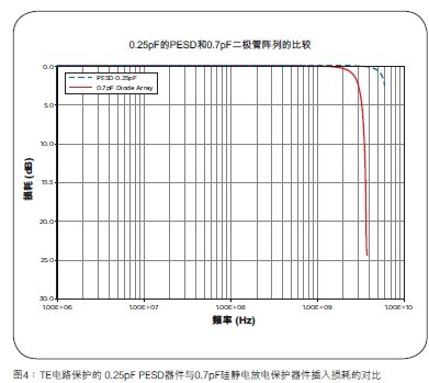 圖4對TE電路保護的PESD器件和普通的0.7pF硅靜電放電保護解決方案進行了對比。TE電路保護的PESD器件的插入損耗可以忽略不計,即使是在HDMI1.3規(guī)范規(guī)定的最高速度3.4GHz運行時。普通的0.7pF硅靜電放電保護器件通常表現(xiàn)出其插入損耗隨頻率增加急劇增加的特點,當HDMI以1080p 36位色彩深度的2.25GHz速度運行時,給TMDS信號引入的插入損耗超過3dB。以更高的分辨率和顏色深度的3.4GHz全速運行時,硅靜電放電保護器件可以造成超過6dB的信號衰減,有效地消減了一半以上的信號電平。