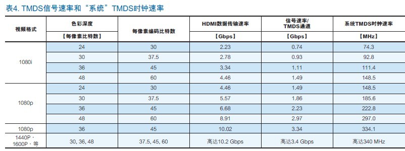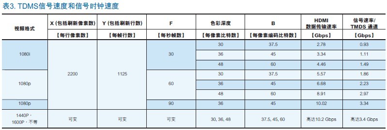 為了說明鏈路數(shù)據(jù)速率和物理TMDS對之間的關(guān)係,表3結(jié)合了表2中的信息與TMDS對信號速度,以及相應(yīng)的信號時鐘速度。