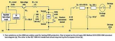 最流行的HBM變種是國際電工委員會(huì)IEC1000-4-2標(biāo)準(zhǔn),定義為150pF電容通過一個(gè)330Ω電阻放電(圖1b)。這是歐盟對(duì)在其區(qū)域內(nèi)商品銷售所必須的國際測試。