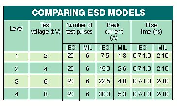但是,明顯的瞬間電壓威脅和能量等級(jí)的不同存在于兩個(gè)模型之中。于是設(shè)計(jì)工程師可以使測試過程適合他們所期望的具體應(yīng)用。例如,IEC1000-4-2具有一個(gè)非常快速的電平脈沖上升時(shí)間,能應(yīng)用更多的脈沖和更高的峰值電流(見表格)。