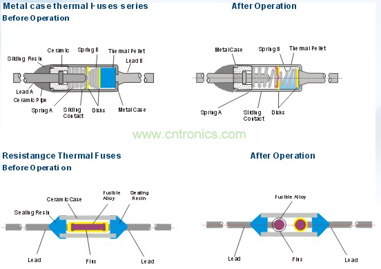 當(dāng)溫度保險(xiǎn)絲周圍溫度上升到它的動(dòng)作溫度時(shí),其易熔合金熔化并在表面張力作用下及特殊樹脂幫助作用下,收縮成球狀附兩引腳未端或保險(xiǎn)絲內(nèi)彈簧的彈力推走電極作用,這樣電路被切斷