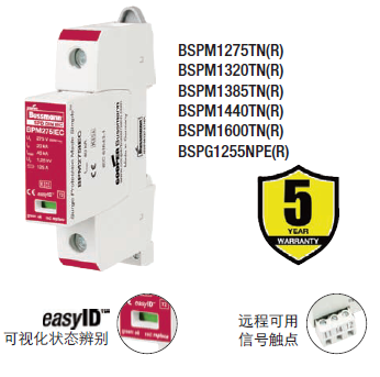 Cooper Bussmann IEC I級230伏、三極、結合了雷電流和浪涌保護器的模塊具有兩個特色:局部的、easyIDTM可視化辨別