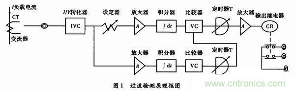 過流檢測傳感器的工作原理如圖1所示。通過變流器所獲得的變流器次級電流經(jīng)I/V轉(zhuǎn)換成電壓,該電壓直流化后,由電壓比較器與設(shè)定值相比較,若直流電壓大于設(shè)定值,則發(fā)出辨別信號。但是這種檢測傳感器一般多用于監(jiān)視感應(yīng)電源的負(fù)載電流,為此需采取如下措施。由于感應(yīng)電源啟動時,啟動電流為額定值的數(shù)倍,與啟動結(jié)束時的電流相比大得多,所以在單純監(jiān)視電流電瓶的情況下,感應(yīng)電源啟動時應(yīng)得到必要的輸出信號,必須用定時器設(shè)定禁止時間,使感應(yīng)電源啟動結(jié)束前不輸出不必要的信號,定時結(jié)束后,轉(zhuǎn)入預(yù)定的監(jiān)視狀態(tài)。