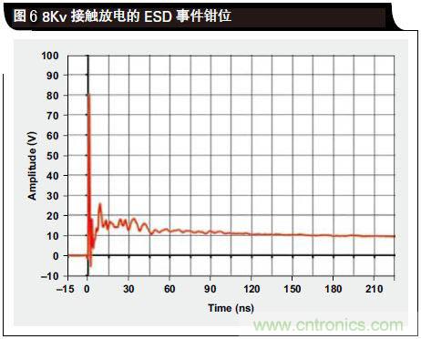 把鉗位電壓波形下面的區域想像成能量。鉗位性能越好,受保護ESD敏感型器件在ESD事件中受到損壞的機率也就越小。由于鉗位電壓很小,一些TVS可承受IEC模型的8kV接觸式放電,但是“受保護”器件卻被損壞了。