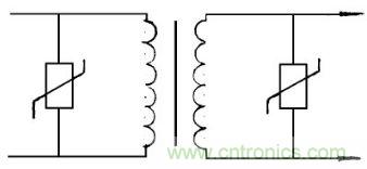 圖6中在特殊條件下使用的照明燈具, 要求極為嚴格, 采用了隔離變壓器, 這時壓敏電阻應在隔離變壓器的初級, 次級線圈繞組兩端同時使用壓敏電阻器, 它能吸收抑制來自輸入電壓的浪涌, 過壓雷擊或開關引起的電火花干擾等。