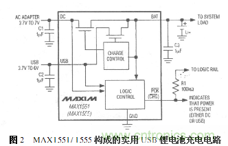 圖2是由MAX1551/1555構成的一種實用USB鋰電池充電電路。MAX1551/1555是MAXIM公司設計生產的USB單節鋰電池充電芯片,為5引腳薄型SOT23封裝,允許USB接口或者墻壁AC適配器3.7V~7V范圍的電壓輸入。芯片內部還具有溫度限制電路。