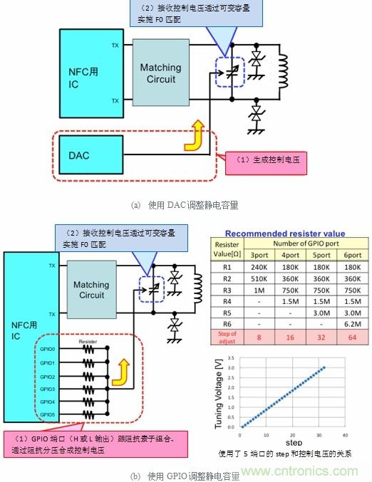 第二, 如圖2(b)所示,從NFC用IC等GPIO端口生成控制電壓來調整靜電容量。GPIO是General Purpose Input/Output的簡稱,是IC芯片提供的輸出端子的一種。特定用途和信號尚未明確,但可以根據軟件指令進行任意的輸出變化。比如說,軟件指示為輸入“0”的話則為0V,指示為輸入“1”的話則有可能會執行輸出3V的操作。如果利用GPIO的輸出端子的話,如果收到的是0V、3V這兩個值的輸出信號,那么執行的操作就是通過2n的電子元件的組合來實現合成2n的阻抗電壓。