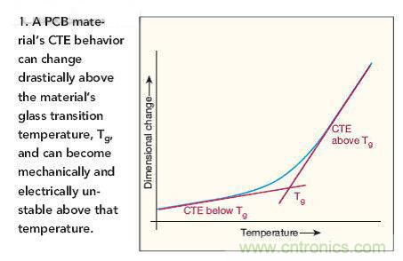 圖1:PCB材料的熱膨脹系數(shù)(CTE)特性在高于材料的玻璃化溫度Tg時(shí)會(huì)發(fā)生急劇變化,并且在機(jī)械和電氣方面變得不穩(wěn)定