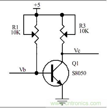 3、當(dāng)我們調(diào)節(jié)可調(diào)電阻,R1,使R1=2.15K時(shí),通過(guò)歐姆定律我們可以計(jì)算得到,Ib=(5-0.7)/2.15K=2mA,那我們就可以計(jì)算出IC=Hfe*Ib=20mA,假如這個(gè)時(shí)候我調(diào)節(jié)R3,使R3=1K歐姆,通過(guò)計(jì)算我們可以得到Vc=5-(20mA*1K)=-15V,回出現(xiàn)-15V嗎,當(dāng)然也不會(huì),同樣因?yàn)闆](méi)有負(fù)壓,所以Vc的電壓會(huì)停留在0V,那這個(gè)時(shí)候我們?cè)賮?lái)看下Ic到底是多少?