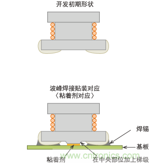 在 生產第一代LQN5N及第二代LQH32M時,雖會對部分混合IC基板進行回流焊接,但一般是對裝有插腳零部件的基板背面進行波峰焊接。其貼裝方法是將膠 粘劑涂在基板焊盤的中央部或貼片元件電極的中央部,待其固化后將其投入波峰焊接槽。與CR貼片元件相比,體積較大的LQH系列在受到焊錫流動阻力后易發生 脫落,因此在電極間中央部位設計了突起(稱為梯級磁芯)。現在看來的話,是反向支架形狀。至今再也見不到這種結構。