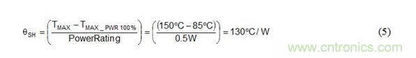 另外,電阻器也不可能在 100% 額定耗散 (TMAX_PWR100%)、85°C 下工作。您可通過該溫度、最大工作溫度以及電阻器的功率額定值計算出針對 θSH 的值,如圖 5 所示。