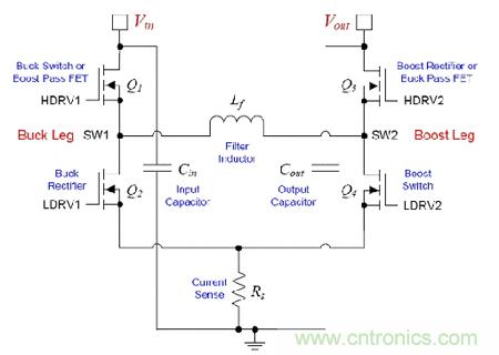 作為一個既提供升壓轉換又能執行降壓轉換的有效方法,一款設計合理的降壓-升壓電路由于其便利性而成為一個不可或缺的器件。我們來復習一下圖1中所示的4開關(非反向)同步降壓-升壓拓撲。