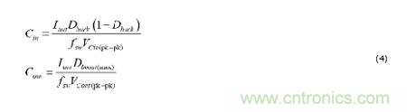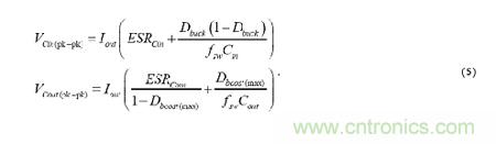 在圖4中,步驟4和5是指分別由降壓和升壓工作模式設定的輸入和輸出電容值。高密度設計越來越多地將數個X5R-或X7R-介質陶瓷元件組合在一起,有時還附帶著一個小尺寸電解電容器來實現大批量儲能功能。方程式4使用針對峰值到峰值的紋波電壓,在假定沒有等效串聯電阻 (ESR) 紋波分量的情況下設定基線電容估計值。