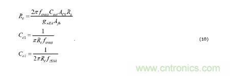 小信號控制環路補償性能由2個基礎波特圖度量標準測定:交叉頻率和相位裕量。由RC和CC1決定的補償器零頻率提供交叉頻率之前的相位提升。位于輸出電容器ESR零點附近(或者是開關頻率的一半,以低者為準),隨CC2建立起來的一個極點提供噪聲衰減,并且盡可能地將到COMP節點的輸出紋波傳播降到最低。使用以下方程式選擇補償組件: