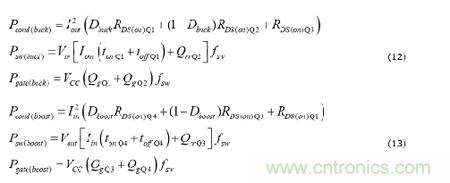 方程式12和13分別計算降壓和升壓模式下的傳導、開關和柵極驅動損耗。針對降壓-升壓模式的相應表達式是方程式12和13的權重組合,其依據是降壓-升壓窗口中的運行點,并且將頻率除以2。
