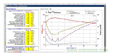 圖5. 步驟8是指MOSFET技術規格、效率曲線圖和功率損耗分析。