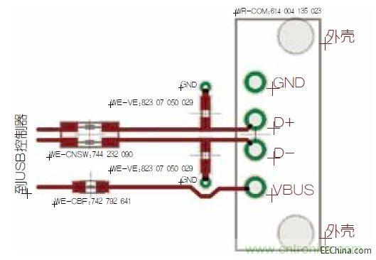從圖3可以明顯看出,有兩條差分信號線(D+和D-)從插頭連接器連接到TVS二極管,再通過電流補償式數據線扼流圈連接到USB控制器。這樣能夠得到出色的靜電放電保護功能,并能良好的抑制數據線對。VBUS通過TVS二極管路由到貼片磁珠。在貼片磁珠之后,可以插入額外的電容和另一個貼片磁珠來實現最大可能的PI濾波器衰減。