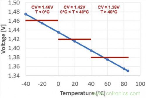 圖2.每電芯1.40 V充電電壓與溫度的關系
