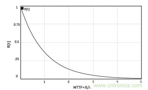 這是因?yàn)椋哂泻愣ü收下实墓收嫌梢粋€(gè)指數(shù)因子表征,如以下等式所示,用于計(jì)算元器件在給定時(shí)間后沒有發(fā)生故障的可能性:R(t) = e-λt