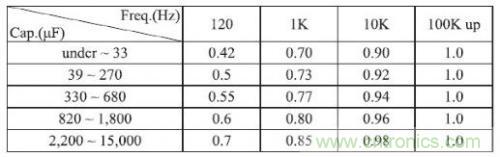 該紋波電流需在電源開關頻率下選擇,如下圖某廠家電容手冊的紋波電流有頻率因子,不同頻率下的紋波電流不同。高頻低阻電容均會給出100kHz下的紋波電流,本設計開關頻率為60kHz,頻率因子為0.96~1之間,在此取1即可。