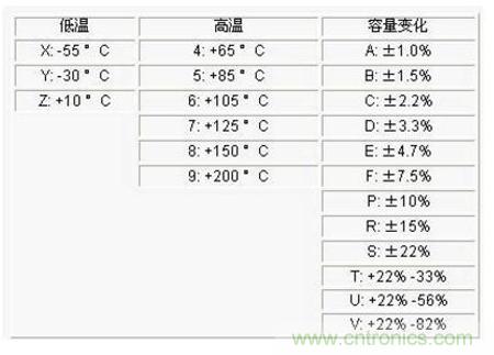 對于其他的編碼與溫度特性的關系,大家可以參考表4-1。例如,X5R的意思就是該電容的正常工作溫度為-55°C~+85°C,對應的電容容量變化為±15%