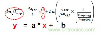這個(gè)一般描述可解釋為直線函數(shù) y = ax + b,其中 y 代表暴露時(shí)間 texp 的 ln√,x 代表 1/T(= 絕對溫度 T [開爾文] 的倒數(shù)),如圖 3 所示。