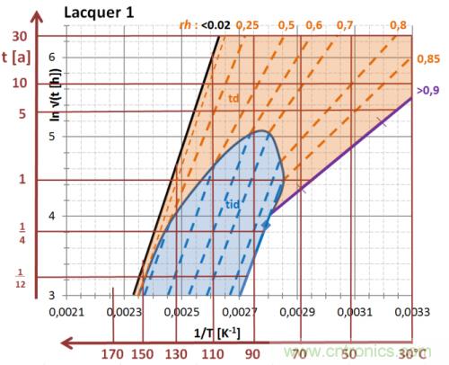 由于標(biāo)準(zhǔn)化的暴露時(shí)間 ln√texp 是溫度倒數(shù) 1/T 的直接函數(shù),所以可用一個(gè)圖表,亦即用 ln√t – 1/T 圖描述和總結(jié)元件在整個(gè)溫度-濕度-時(shí)間域中的性能和健康預(yù)測,以及其系統(tǒng)特征鑒定: