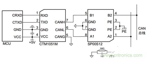 圖6是一個 CAN節點電路設計,在收發器與CAN總線間添加 SP00S12,可使 CAN 信號端口輕松滿足 IEC61000-4-5 ±4KV 的浪涌等級要求。