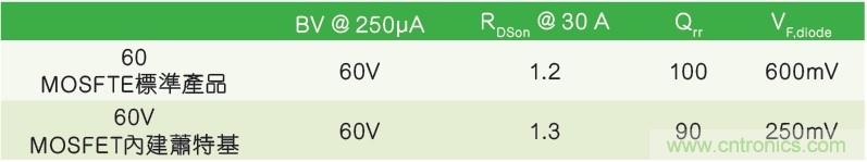 當只有優(yōu)化Qrr和VF,diode才能提高系統(tǒng)總體性能時,集成肖特基二極管的新60V MOSFET是一個正確選擇。圖3列出了標準MOSFET和集成肖特基的功率開關的主要電參數(shù)(兩款產(chǎn)品的BVDSS和芯片尺寸相同)。