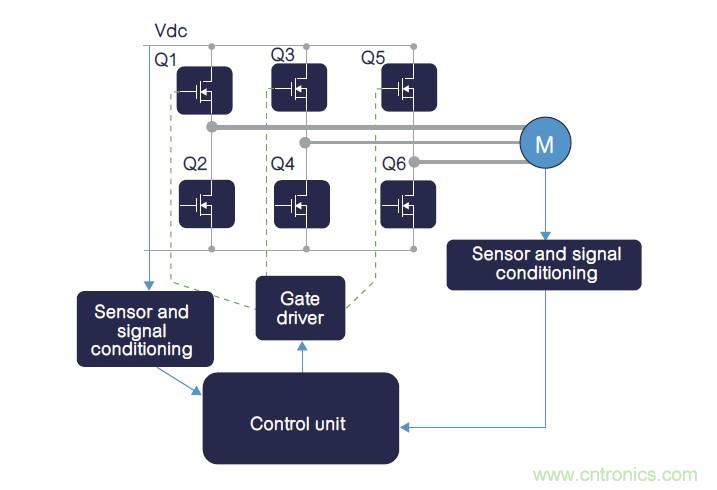 在電橋拓撲內,反向恢復過程從下橋臂開關(圖7中的Q2)續(xù)流結束時開始,到上橋臂開關(圖7中的Q1)開始導通時終止,且最終的恢復電流加到上橋臂電流內。連同上橋臂開關上的額外電流,下橋臂反向恢復過程與Vds≈0V到Vdc換向操作,可能會在下橋臂開關閘源電壓上產(chǎn)生雜散跳變電壓,因為下橋臂Ciss(輸入電容)是透過Crss(Miller電容)完成充電過程。