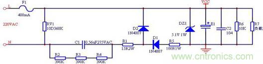 采用半波整流方式,根據計算式I1=0.5|I|=34500C可知,C=0.43uF。所以此處選用0.47uF的電容,反過來可以驗證提供的電流I1=34500C=16.2mA,多余電流從穩壓管流過。