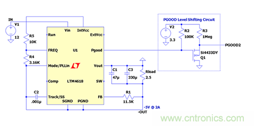 下面舉例說明在負輸出配置中使用LTM4618時PGOOD引腳電平轉換電路的設置。V IN = 12V,-V OUT = -5V @ 3A。
