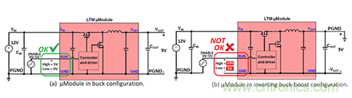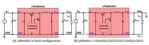 圖1.僅僅幾個連接變化將一個降壓μModule穩壓器(a)轉換為一個負輸出穩壓器(b)