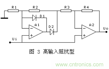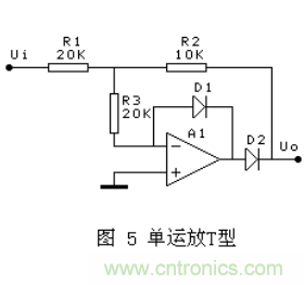 圖5 和 圖6 要求R1=2R2=2R3,增益為1/2,缺點(diǎn)是:當(dāng)輸入信號(hào)正半周時(shí),輸出阻抗比較高,可以在輸出增加增益為2的同相放大器隔離.另外一個(gè)缺點(diǎn)是正半周和負(fù)半周的輸入阻抗不相等,要求輸入信號(hào)的內(nèi)阻忽略不計(jì)。