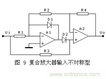圖9要求R1=R2,R4可以用來(lái)調(diào)節(jié)增益,增益等于1+R4/R2;如果R4=0,增益等于1;缺點(diǎn)是正負(fù)半波的輸入阻抗不相等,要求輸入信號(hào)的內(nèi)阻要小,否則輸出波形不對(duì)稱。